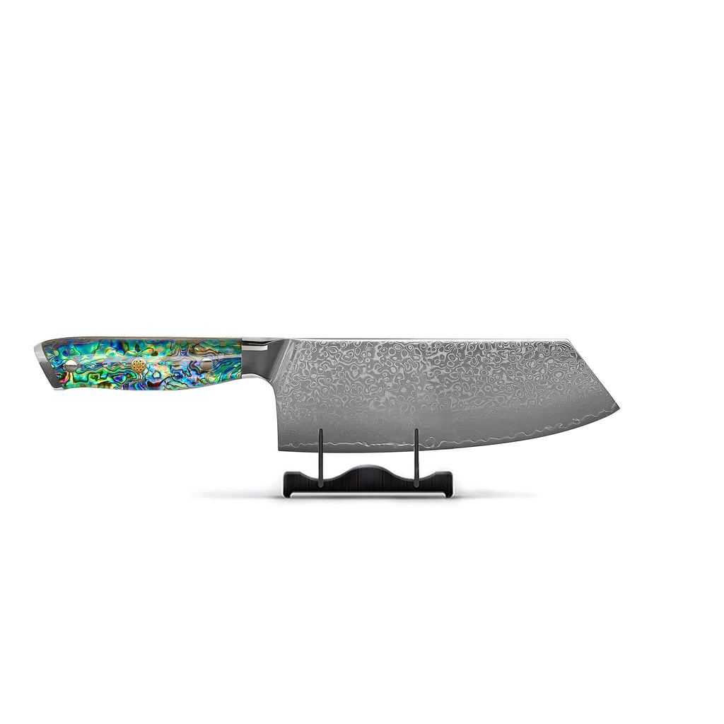 This series is distinguished by its exceptional handles, crafted from polished mother-of-pearl shells combined with synthetic resin. The sheen and color variations are beautifully vivid in the light, making each handle a unique work of art. Thanks to the three rivets , the handle and blade are firmly and permanently connected. The blade itself is composed of 67 layers of high-quality VG-10 Damascus steel , hardened to a remarkable 62 HRC Rockwell, razor-sharp, strong, and built to last for generations.