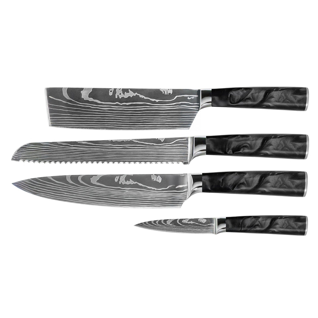 Damascus Print Epoxy Onyx 4-Piece Knife Set - Chef's Knife + Bread Knife + Nakiri + Paring Knife