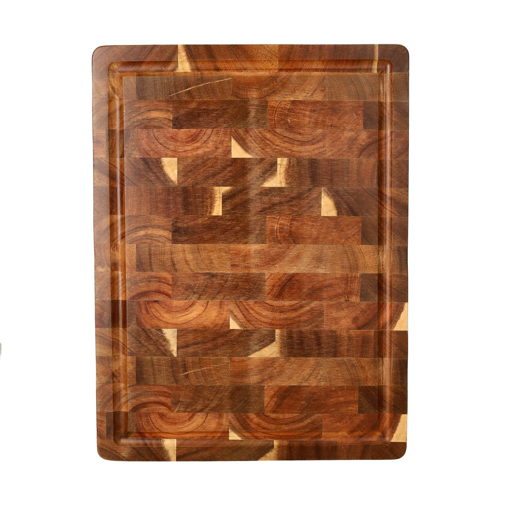 • Luxury Acacia Wood Cutting Board - End Grain (41 x 30 x 4.5 cm): This sturdy cutting board is crafted from end grain acacia wood—a sustainable wood that's knife-friendly and durable. Thanks to the end grain, the board absorbs less impact, protecting your knife blade. Equipped with handles, treated with a natural oil, and perfect for intensive daily use.