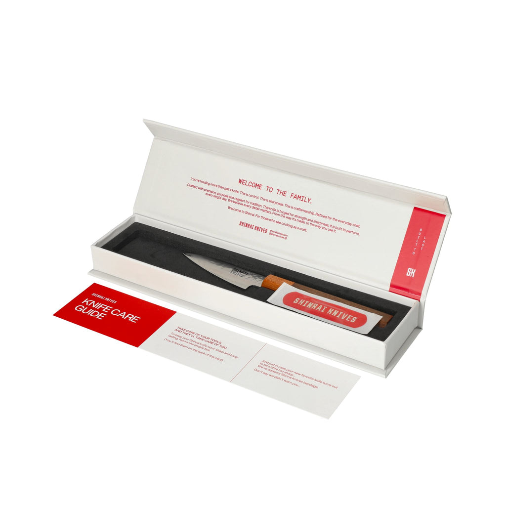 The Shinrai Knives Kigami Exclusive 7-piece knife set comes in a luxurious gift box, which not only offers protection but also a stylish presentation. Perfect as a gift for a culinary enthusiast or as the crowning glory of your own kitchen.